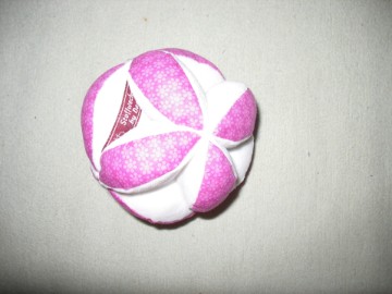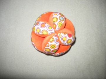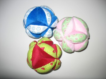 Die Greifbälle haben einen Umfang von ca. 39 cm und sind aus Baumwoll- und Nickistoffen angefertigt. Zudem ist eine Rassel eingearbeitet.